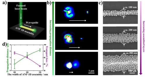 在以上研究的基础上, 他们通过构筑微米尺度的模板结构,实现了对基材表面液膜破裂行为的控制,得到了形貌可控的微米线状高分子图案(Small 2013, 9,722-726)。进一步将对液膜破裂的控制与打印过程中的液滴调控相结合,利用咖啡环效应成功得到线宽为5-10 μm的金属纳米粒子图案(Adv. Mater. 2013, 25,6714-6718)。基于以上研究成果,他们提出了一种通过控制液膜破裂实现多种纳米粒子大面积精确组装的普适方法(图1),并研究了银纳米粒子组装后在等离子光波传输方面的应用(图2)。这种新型图案化技术可以简便地进行纳米粒子微、纳米尺度图案的精确组装,可以通过“印刷”方式大面积制备纳米粒子组装的精细图案和功能器件,乃至实现单个纳米粒子的组装与图案化,对印刷技术的功能化和器件化发展具有重要意义。该研究结果发表在近日出版的Adv. Mater. 2014, 26,2501-2507上, 并被选为封面论文,前期已申请国际(PCT)发明专利。