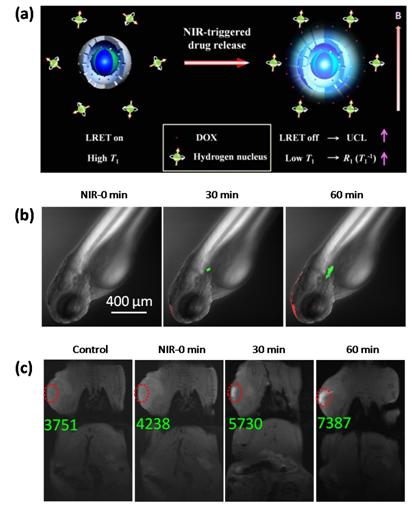 (a)UCL/MRI双模式成像同时监控药物释放原理;斑马鱼(b)及SD大鼠(c)水平的药物释放实时监控效果。