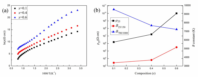 (a) 复合陶瓷材料lnρ与1000/T的关系图; (b) 电阻率及B值随x量变化曲线图