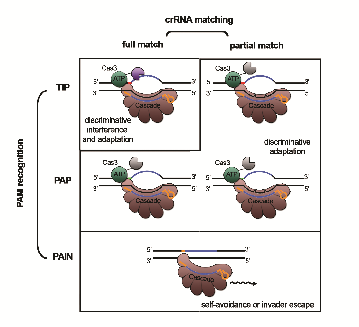 接着,该组研究人员构建了64种重组质粒,使它们携带相同的protospacer序列和64种不同的三联核苷酸充当其PAM(protospacer adjacent motif)。有意思的是,CRISPR只能干扰其中4种PAM对应的重组质粒,却能“引发”23种PAM对应质粒(包括被干扰的4种)的适应过程,而其它41种PAM质粒则安全“躲避”了CRISPR系统的免疫。该团队进一步证明位于宿主CRISPR结构中spacer旁边保守的三联核苷酸AGC(属于上述41种PAM),是帮助spacer同时“躲避”了干扰和引发适应过程的决定性因素。该研究表明PAM验证机制在适应过程和干扰过程中都发挥重要作用,但在适应过程中表现出更宽松的PAM选择性,因此该过程能耐受靶分子上更多的PAM突变,同时PAM验证机制又可以避免在宿主自身的spacer DNA处引发适应过程。该工作进一步解析了CRISPR适应过程中的异己区分机制,即“PAM验证的引发机制”。相关论文已于近期在线发表在Nucleic Acids Research (doi: 10.1093/nar/gku389) 上,博士生李明为该篇论文的第一作者。