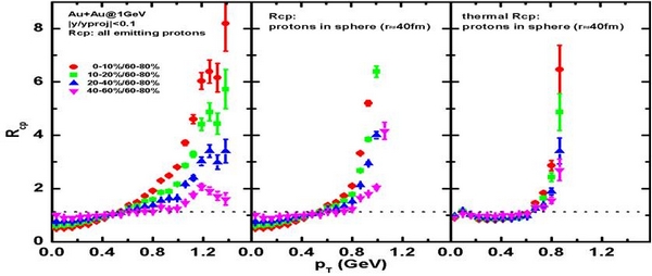 该研究发现,中能区质子的核修正因子随横动量的增加而增强,在高横动量区域并不像高能区受到压制(<1)。这是因为受径向膨胀流的推动和核子-核子多重散射的Cronin 效应作用使得质子被推向更高横动量区,而中能重离子碰撞形成的物质的密度温度还不足够大,因此粒子参过这种物质时其能损还不足够压制高横动量质子的产生。