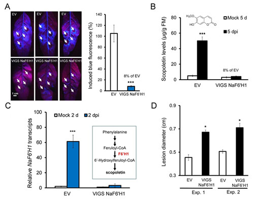 B: 接种5天后,转化了空载体的叶片大量的积累scopoletin,而在转化了NaF6’H1基因沉默载体的植物的叶片中,scopoletin的水平不受诱导。