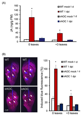B: 左图上方是两张野生型(WT)的幼嫩叶片被链格孢菌感染1天后在紫外灯下的照片,下方是不能合成JA的AOC基因被沉默的植物(irAOC)被链格孢菌感染1天后的照片。右图显示的是在野生型(WT)和不能合成JA的irAOC植物的叶片中被诱导的蓝色荧光的量。
