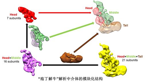 中介体在转录中扮演关键角色,被称为“转录中央控制器”。它是由几十个不同蛋白质组成的庞大的分子机器,由头部、中部、尾部3个稳定模块构成;其模块化结构和亚基组成从低等的酵母到高等哺乳动物高度保守。冷冻电镜是当前能够解析完整中介体三维结构的唯一方法。但受限于结构上的复杂性,已报道的电镜结构分辨率很低,无法定位各个模块,甚至头部模块的晶体结构对接到中介体电镜结构的位置都不确定。原先对于中介体的模块化结构认识模糊,且与大量结构和功能实验数据相抵触,大大限制了对中介体精细结构和作用分子机制的认识。