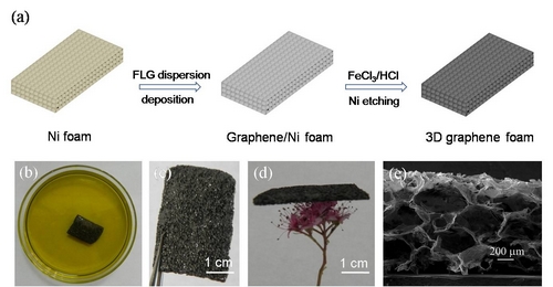 图2. (a)构建石墨烯泡沫的流程示意图。(b)石墨烯/泡沫镍复合材料进行镍刻蚀的光学图片。刻蚀剂:FeCl3/HCl (1 M/1 M)的混合溶液。(c)石墨烯泡沫的光学图片。(d)石墨烯泡沫在花上的光学图片。(e)石墨烯泡沫截面的扫描电镜图。