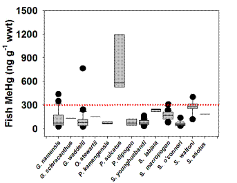 研究人员在青藏高原南部的13处河流和湖泊中(图1)采集了13种鱼类共计166尾样本,对其进行了总汞和甲基汞等分析发现,高原鱼类的总汞和甲基汞含量分别为25.1~1218 ng g−1和24.9~1196 ng g-1(以湿重计,下同),这与我国东部地区鱼类汞含量相当,部分鱼类汞含量甚至高于某些汞污染区域鱼类的汞含量。例如,采集自林芝地区八一镇附近雅鲁藏布江的3尾黄斑褶鮡的甲基汞含量达525~1196 ng g-1(图2),是我国野生淡水鱼汞含量的最高记录之一。这与青藏高原环境介质中极低的汞含量水平形成强烈反差。