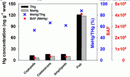 图3 纳木错水生动物汞含量(柱形)、甲基汞比例(蓝色)和富集系数(BAF-五角星)分布图