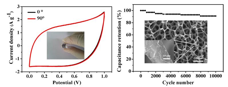 该团队首先通过溶剂挥发自组装法(EISA)将有序介孔碳薄膜均匀涂覆在三维石墨烯上,然后再引入高导电性的一维银纳米线,构筑了具有三维纳米导电网络结构的一维银纳米线/三维石墨烯/有序介孔碳复合材料。在该复合结构中,三维石墨烯和银纳米线在提升有序介孔碳性能方面扮演了同等重要但不同的角色。三维石墨烯为材料提供了高导电性与机械强度的柔性骨架,而银纳米线则进一步优化表面的电子传输通道,减小极化和界面内阻。两类材料协同作用,极大提升了有序介孔碳材料的电化学性能,其电导率达到762 Scm-1。组装成柔性器件后,复合电极材料比电容达到213 F g-1,是本征介孔碳材料的5倍。另外,该柔性器件的循环稳定性极佳,在循环10,000次后能保持90%以上的容量。