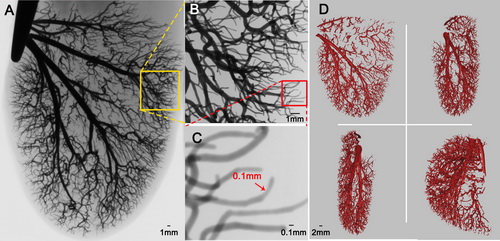 针对这一关键需求,联合小组基于实验室在液态金属材料与生物医学工程学两个领域的长期研究积累,成功证实了有别于传统血管造影方法的液态金属血管造影方法的高效性。研究表明,以镓为代表的一系列合金材料在室温下呈液态,可在不破坏组织结构的情况下灌注到血管网络中,同时其自身拥有的高密度会对X射线造成很强的吸收作用,因而在X光拍摄或CT扫描中,充填有液态金属的血管会与周围组织形成鲜明对比,由此达到优异的成像效果,而液态金属的流动性和顺应性甚至可以让极细微的毛细血管也能在图像中以高清晰度的方式显现出来。实验发现,当将室温液态金属镓分别灌注到离体猪的心脏冠状动脉以及肾脏动脉中时,重建出的血管网络异常清晰,造影效果远优于临床上常用的碘海醇增敏剂,图像对比度呈数量级提升,揭示的血管细节更加丰富,且造影效果不会如传统增敏剂那样随时间逐步衰减。1年多以来,实验室就离体动物器官进行了多种测试,获得了丰富的数据,而针对小鼠全身血管的重建工作则促成了对有关动物生理学的深入认识。