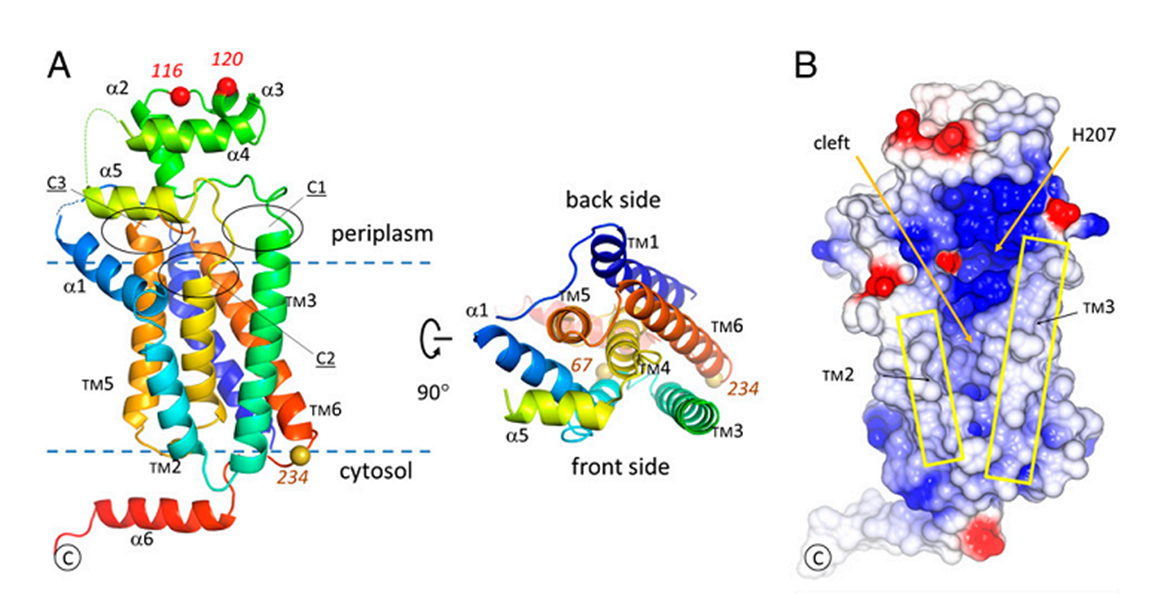 大肠杆菌PgpB的整体结构。图A. PgpB的结构卡通图展示。蛋白N端到C端用从蓝到红的彩虹颜色展示,PAP2家族中的特征性模体用黑色椭圆圈标出。图B. PgpB的分子表面电势图。正电区域用蓝色表示,负电区域用红色表示,跨膜螺旋2和3用黄色方框表示。