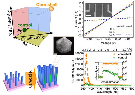 针对上述挑战,研究人员提出了一种新颖的纳米线界面掺杂策略,通过发展CVD再生长技术,制备出具有“核-界面-壳”结构的ZnO纳米线,其电导率高达4×104 S/m,比常规纳米线提高一个量级以上,且其带边发光强度也高出一个量级。通过进一步的高分辨表征发现:界面Zn掺杂提供高浓度的自由电子,这些自由电子在界面区域形成准二维电子气,导致优异的电学性能;同时,界面层又会显著减少激子向纳米线表面耗尽层扩散并被消解的几率,从而提高激子的带边发射效率。
