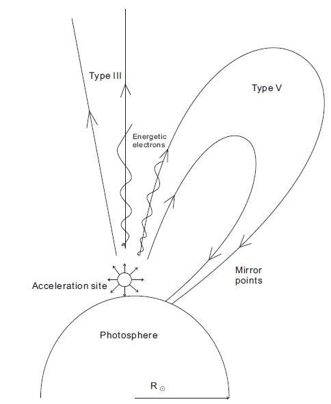 研究人员根据太阳射电V型爆发和III型爆发的这些观测特征,认为产生III型爆发和V型爆发的高能电子起源于同一个加速区,被加速的高能电子,一部分沿着开放的磁力线向上运动,由于电子回旋脉泽不稳定性产生了III型射电辐射。另一部分高能电子则被闭合的磁力线捕获,电子在这样一个磁环中运动,激发了电子回旋脉泽不稳定性,从而产生射电V型爆发。