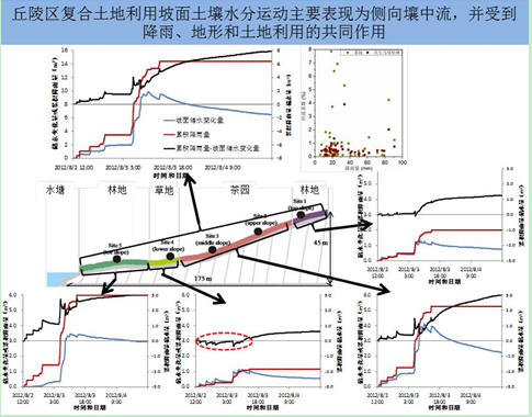 依托时域反射技术和大地电导率仪等地球物理探测技术,研究人员对太湖流域平原区和丘陵山区的典型土地利用方式(平原农田、平原菜地、平原林地、丘陵茶园、丘陵竹林、丘陵荒草地和丘陵混交林)不同尺度(一维尺度和坡面尺度)的土壤水分运移过程进行监测和解译。研究发现,壤中流是不同土地利用方式下土壤水分运动的主要途径;在丘陵山区坡面,土壤-母岩界面的侧向壤中流对坡脚和坡面转折处的水分补给尤为明显,是氮素流失的主要途径;在平原地区,垂向的壤中流和不透水土壤层界面的侧向壤中流活跃,也会携带污染物质向地下水和地表水体迁移。