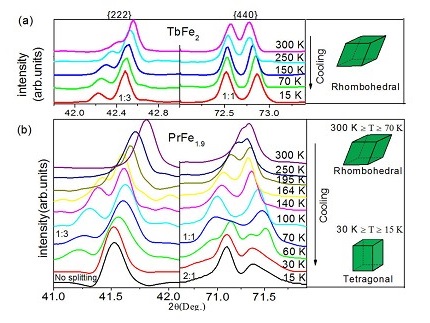 2013年,该课题组利用SHMFF X射线衍射仪开展了具有立方Laves相结构的PrFe2合金研究,首次报道了PrFe2稀土合金中的巨磁致伸缩以及自旋再取向等效应。但是,对这一体系材料的巨磁致伸缩效应的物理机制尚不清楚。本次研究在上次研究的基础上,增加了对TbFe2新样品的研究,并与PrFe2进行了对比,对这一体系的磁致伸缩的物理机制进行了理论解释。