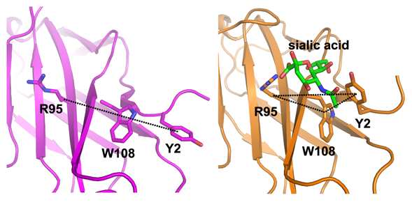 为了探究PILR与唾液酸互作的分子基础,从而对上述科学问题给出精确的科学解释,中国科学院微生物研究所高福研究团队通过结构生物学方法首先对PILRα和PILRβ的结构进行了深入研究。结果表明两种分子均具有典型的siglec-样折叠,但缺少siglec分子特有的二硫键,取而代之利用一组疏水互作稳定分子构象。在PILR/唾液酸的互作研究中,研究人员建立了一种以I型单纯疱疹病毒(HSV-1)的gB蛋白为依托的表面等离子共振检测方法,并通过定点诱变,证实了PILRα分子表面的Y2,R95和W108所形成的“三残基”模块在唾液酸结合中的关键作用;而PILRβ正是由于该模块中的W108L突变导致其失去了与唾液酸互作的能力。通过进一步的复合物结构研究,高福研究团队还首次揭示了PILRα识别唾液酸的分子细节:与单体PILR结构相比,复合物结构中Y2氨基酸发生了显著的构象和空间位置的变化,从而使上述的“三残基”模块由唾液酸结合前的线性排列转变为唾液酸结合后的三角模式排列(如图)。
