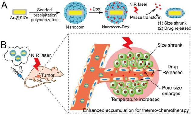 图 1. 纳米复合物Au@SiO2@polymer制备过程(A)与肿瘤靶向治疗应用图示(B)