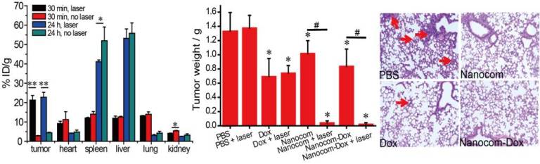 图2. 纳米复合物在激光照射下显著富集于肿瘤组织,其产生的热化疗协同效应,有效抑制了肿瘤的生长与转移。