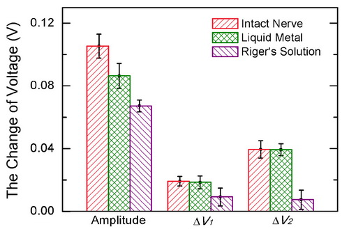 在题为Liquid Metal as Connecting or Functional Recovery Channel for the Transected Sciatic Nerve(Jie Zhang, et al., arXiv:1404.5931)的论文中,研究小组首次证实了以液态金属作为高传导性神经信号通路的可行性。通过建立牛蛙腓肠肌模型,采用液态金属连接剪断的神经组织,借助微弱电刺激试验探明了液态金属神经传导的优势。结果表明,利用液态金属连接的神经模型能很好地传递刺激信号,与剪断前的正常神经组织在信号传导方面具有高度的一致性和保真度,显著优于传统的林格氏液。与此同时,由于液态金属在X射线下具有很强的显影性,因而在完成神经修复之后很容易通过注射器取出体外,从而避免了复杂的二次手术。这一方法为神经连接与修复开辟了全新方向。