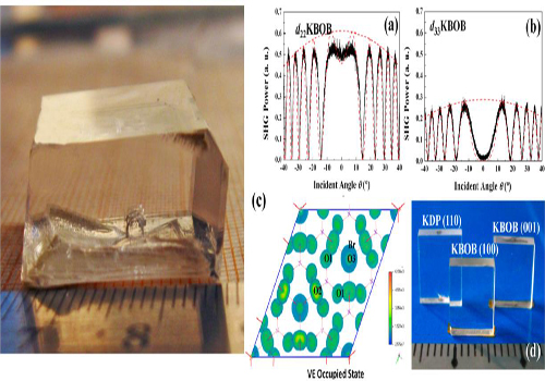 近期,该团队科研人员通过调整合适的助熔剂比例,降低晶体生长温度和粘度,在国际上首次采用高温熔液法获得了尺寸为22 mm × 22 mm × 10 mm的透明K3B6O10Br单晶,晶体生长成品率达到70%。同时,对晶体切割单晶器件,测试了其非线性光学系数,研究了其相位匹配性能。基于第一性原理计算,分析了其电子结构特征,分析了其结构性能关系。研究表明,K3B6O10Br能够实现Nd:YAG激光直接290nm倍频输出,通过和频方式能够实现266nm激光输出,在紫外非线性光学领域有潜在的应用前景。该研究成果不仅能为含易挥发元素单晶生长提供技术借鉴,也提供了新的非线性光学晶体参与国际竞争。