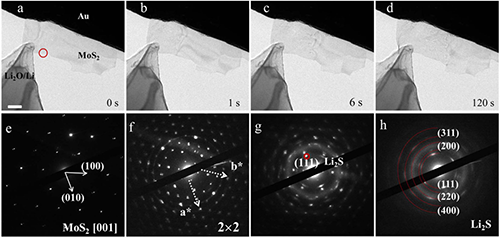 中国科学院物理研究所/北京凝聚态物理国家实验室(筹)表面物理国家重点实验室多年来通过研制原位透射电镜中的扫描探针装置,开展定量纳米表征和新型器件机理研究。最近,该室博士生王立芬、副研究员许智、研究员王文龙和白雪冬基于原位透射电子显微镜(in-situ TEM)技术,在透射电镜中设计并搭建了以MoS2纳米片为工作电极的锂离子半电池,在原子尺度原位实时观察到MoS2纳米片中嵌锂导致的两种相变过程。