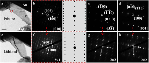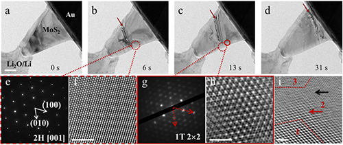 图1. MoS2纳米片在首次锂化过程中的形貌以及结构演变过程
