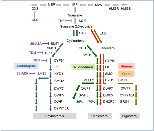 微拟球藻甾醇合成途径,及其与哺乳动物、高等植物和酵母的联系和区别