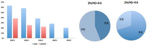 通过建立视向速度测量误差的模型和双星轨道运动速度变化的模型,得到基于SDSS和LAMOST的银河系双星比例,发现SDSS数据中有43%的双星,LAMOST数据中有30%的双星。造成这个差异的原因是两个巡天样本所覆盖的恒星类型不同:LAMOST样本中有更大比例的临近银河系盘上的富金属恒星。为了研究恒星类型对双星比例的影响,他们对不同的有效温度和金属丰度区间重新估计双星比例,发现双星的比例随着恒星的有效温度减小而减小,有效温度6500K以上的恒星,双星比例超过60%,有效温度下降到4500K时,双星比例只有不到20%。同时,他们发现贫金属的恒星中双星比例偏高(接近60%),富金属恒星双星的比例较低(只有不到30%)。
