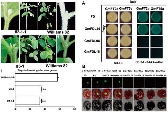 FT(FLOWERING LOCUS T)是植物开花调控途径中非常关键的整合因子。中国科学院东北地理与农业生态研究所刘宝辉研究组和孔凡江研究组首先通过大豆遗传转化的方法,在大豆品种Williams 82中证明GmFT2a和GmFT5a能够促进大豆开花,并发现GmFT2a和GmFT5a促进大豆成花相关基因(GmAP1、GmSOC1和GmLFY)的表达;随后利用酵母双杂交和双分子荧光互补实验发现GmFT2a和GmFT5a与大豆bZIP转录因子GmFDL19相互作用,过表达GmFDL19能够导致大豆品种东农50提前开花,并且GmFDL19同样上调大豆成花相关基因的表达;最后利用凝胶阻遏实验(EMSA)证明了GmFDL19蛋白特异结合GmAP1a启动子的ACGT顺式作用元件,植物开花调控的FT/FD-AP1模式在大豆中是存在且保守的。