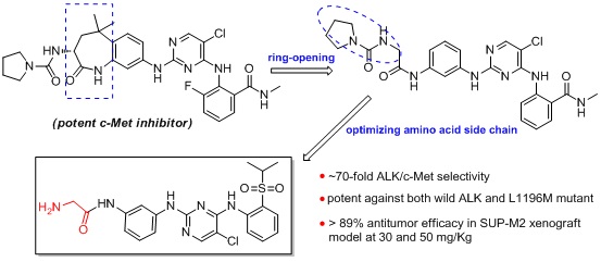 中国科学院上海药物研究所张翱、耿美玉和丁健研究团队,近年来通过紧密合作率先在国内开展靶向ALK第二代抑制剂研究,在前期开展的靶向c-Met特异性抑制剂(J. Med. Chem., 2011, 54, 2127–2142)和双靶向c-Met/ALK抑制剂(ACS Med. Chem. Lett., 2014, 5, 304–308)基础上,对2,4-二氨基嘧啶骨架进行了理性的药物设计和生物活性评价,从数百个化合物中发现了一类含氨基酸侧链的新型ALK抑制剂,与目前文献报道的ALK抑制剂相比,溶剂作用区结构更柔韧。先导化合物对野生型ALK和L1196M突变型抑制活性分别为2.7和15.3 nM,对ALK依赖细胞具有显著增殖抑制活性,但不抑制ALK不敏感细胞增殖。更重要的是,这一化合物对ALK二次突变(L1196M、F1174L)的细胞增殖也具有较强的细胞增殖抑制活性。在ALK依赖的SUP-M2裸小鼠模型上,先导化合物在30和50mg/kg显示100%以上的肿瘤生长抑制活性,值得进一步研究。