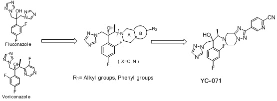 中国科学院上海药物研究所杨玉社课题组综合考虑抗菌谱、耐药特性、水溶性以及代谢性质等,采用生物电子等排﹑变换分子骨架、药效团转化等结构优化的策略,设计合成了一系列100多个具有自主知识产权的新型哌嗪或哌啶并杂环类三氮唑衍生物,并从中筛选出候选药物YC-071。该化合物不仅对常见的致病菌株有较强的体外抑制活性,更重要的是,其对多株氟康唑耐药的菌株也具有较强的抑制活性且优于伏立康唑。YC-071具有良好的药代动力学性质,大鼠口服生物利用度超过100%,对敏感白色念珠菌(SC5314)以及氟康唑耐药菌(白色念珠菌103)感染的小鼠有较强的保护作用,并且表现出了良好的剂量效应关系。