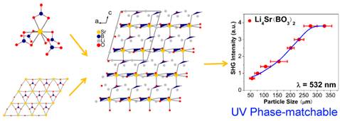 在国家基金委优秀青年基金、科技部“973”重大研究计划等项目的支持下,中国科学院福建物质结构研究所中科院光电材料化学与物理重点实验室罗军华课题组利用尺寸较大的碱土金属阳离子Sr2+与非线性光学活性基元[BO3]3-,成功制备了首个包含[SrBO3]∞平面层的深紫外非线性光学晶体材料Li4Sr(BO3)2 (LSBO)。该材料中[SrBO3]∞平面层继承了KBBF晶体中[BO3]非线性活性基元的最优排列方式(类似KBBF中的[Be2BO3F2]层),同时[SrBO3]∞平面层之间进一步通过[BO3]非线性活性基元紧密连接(其层间作用力相当于KBBF的4.7倍),这使得LSBO晶体既具有适中的双折射率,能够实现有效相位匹配倍频输出,又具有比KBBF更大的非线性光学效应(2.0倍KDP,约相当于KBBF的1.6倍),并且还显著克服了KBBF晶体所具有的明显层状生长习性。LSBO晶体的光学透过范围低至186 nm,且不吸潮、硬度适中、易加工。该晶体有别于传统的硼铍酸盐深紫外非线性光学材料,有望成为下一代深紫外非线性光学优秀候选材料,代表了该领域的一个新发展方向。此外,该课题组与中科院理化技术研究所林哲帅研究员合作,对该材料的光学性质作了理论计算并揭示了其非线性光学效应的来源。相关研究成果发表于Nature子刊《自然通讯》(Nat. Commun., 2014, doi:10.1038/ncomms5019)。