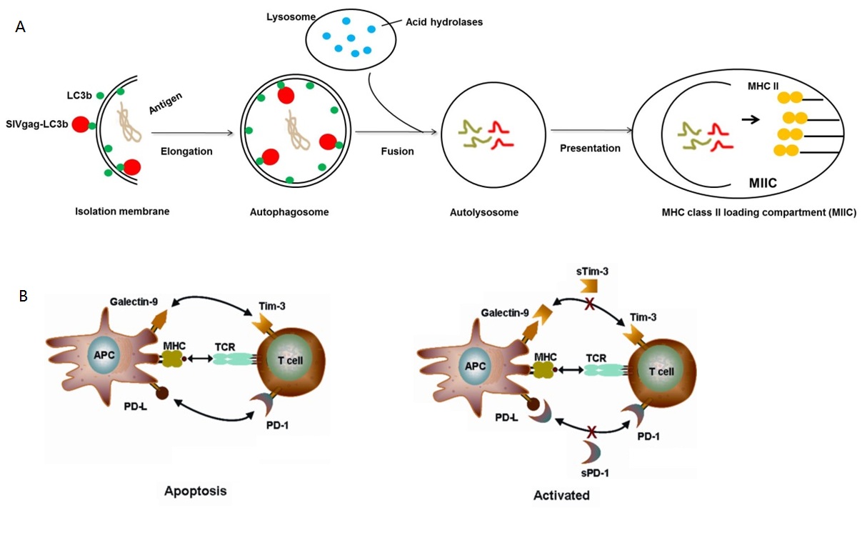 A:利用机体自噬机制对内源性病毒抗原进行MHCⅡ类分子的抗原提呈,从而有效提升HIV病毒特异的CD4+T细胞免疫应答。B: 分泌型PD-1、Tim-3阻断免疫抑制性信号通路之后,可显著增强艾滋病疫苗的CD8+ T细胞免疫应答。