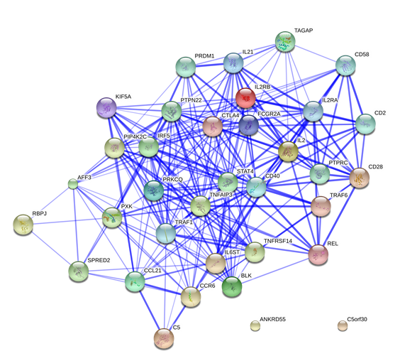中国科学院天津工业生物技术研究所陈祖耕研究组(基因组分析实验室)研究人员认为,麻疹和类风湿性关节炎的关联可能是存在共享的遗传通路。在此研究基础上,该实验室研究人员联合广东医学院和哈尔滨医科大学等单位的多位研究人员搜集了5,539 个来自欧洲的类风湿性关节炎病例样本和20,169个对照样本的全基因组关联研究数据。首先进行基因水平上的关联检验,识别显著的基因;然后进行生物学通路注释,寻找显著的KEGG通路;同时利用已有的知识,包含先前发现的类风湿关节炎风险位点、蛋白质相互作用网络、前期来自风湿性关节炎和其它自身免疫疾病的通路分析结果,最终确认了四个已知的类风湿性关节炎遗传通路,包括Cytokine-cytokine receptor interaction, Jak-STAT signaling, T cell receptor signaling and Cell adhesion molecules。同时首次报道了Measles 和Intestinal immune network for IgA production 通路参与了类风湿性关节炎。这一研究结果可能会解释麻疹和类风湿性关节炎的关联性(即共有的遗传通路参与了这两种疾病),并有助于类风湿性关节炎发病机制的研究。