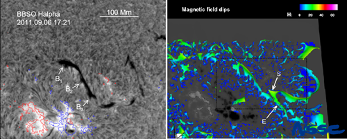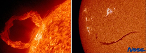 图1 左:正在爆发的日珥;右:日面上观测的暗条。