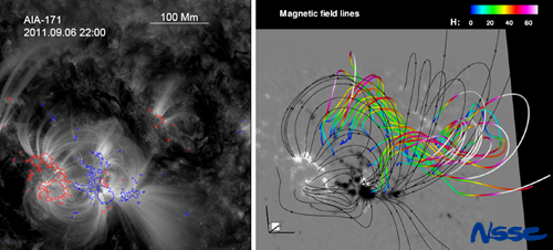 图2 左:SDO/AIA-171观测到的冕环和反S形的暗条;右:重构的日冕磁场,其中含有纽缠的磁绳结构(彩色线条)。