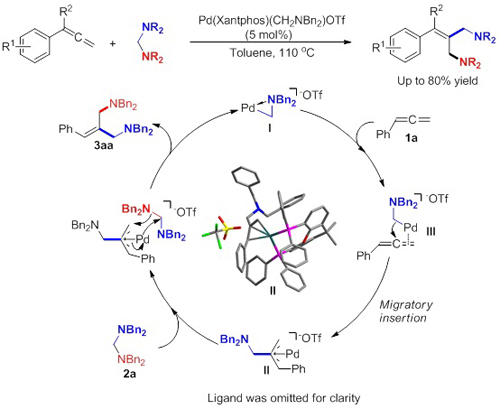 在以上工作基础之上,通过进一步的理性设计,该研究小组采用亲电性更强的钯作为催化剂,通过胺缩醛对Pd(0)的氧化加成活化C-N键,建立了制备特殊三元环“Pd-CH2NR2”亲核试剂的基元反应,在对“Pd-CH2NR2”亲核试剂结构和性质的详细研究基础上,设计、实现了两类新型的催化反应:(1)利用Pd活化胺缩醛的C-N键,实现了烯烃与胺缩醛的Heck反应,一步合成烯丙胺类化合物(J. Am. Chem. Soc. 2012, 134, 20613-20616)。利用该方法可以一步合成治疗晕船症和治疗心血管疾病药物桂利嗪。(2)利用上述新型基元反应,通过进一步的理性分析和实验验证,成功建立了烯基醚的双官能化反应,合成了一系列β-胺基缩醛。β-胺基缩醛可以通过进一步的转化合成β-胺基醇和β-胺基酸(J. Am. Chem. Soc. 2013, 135, 18327-18330)。这些反应过程和机理均通过X-ray单晶衍射、原位核磁、原位反应红外等表征手段得以验证和确认。