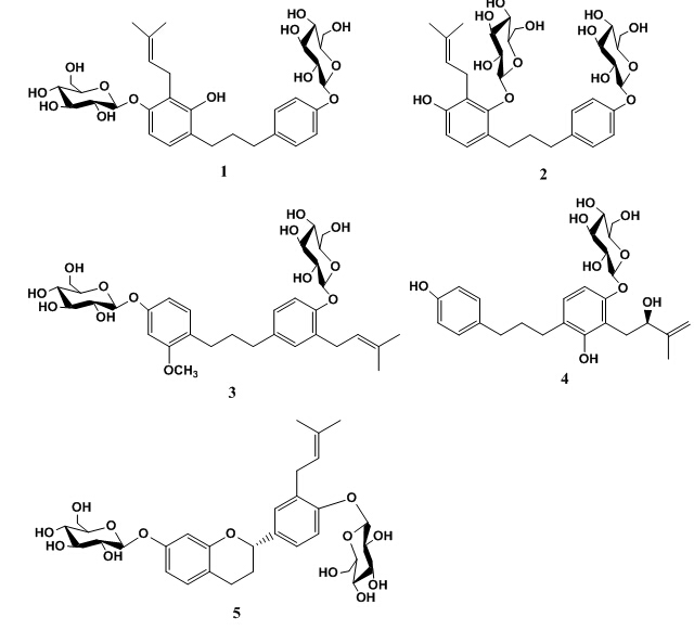 中国科学院成都生物研究所王明奎研究员课题组的杨春艳博士和王飞研究员课题组的相关研究人员合作采用活性导向分离策略,对构树叶中活性成分进行分离、鉴定和生物活性评价。通过溶剂萃取和各种色谱分离手段(包括常压正相和反相柱色谱、凝胶柱色谱和高压制备色谱等)从构树叶提取物中分离得到20个酚酸类化合物,现代波谱技术结合化学方法确定其中5个为新的酚酸类成分。生物活性实验表明其中6个化合物(包括4个新化合物)具有雌激素生物合成抑制活性,8个化合物(包括2个新化合物)显示出较好的抗氧化活性。该文的研究结果表明构树叶中的化学物质可以调节人体和动物体内雌激素的生物合成水平,提示构树叶可开发为保健食品,同时在一定程度上阐述了构树叶作为饲料可以改善动物肉的品质的潜在机理。