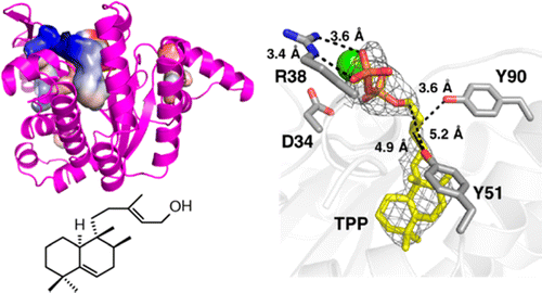 分析二磷酸盐抑制剂BPH-629的复合体结构,发现其中一个BPH-629在底物结合位点内,另一分子则位于二聚体的接触面。通过定点突变研究发现D34、R38、Y51、Y90与产物的形成是密切相关的,其中D34会与镁离子结合,藉以结合底物。