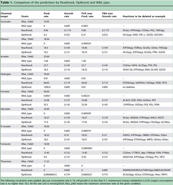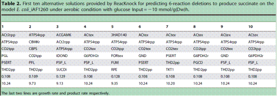 表2 大肠杆菌生产琥珀酸,ReacKnock给出的10个替代解