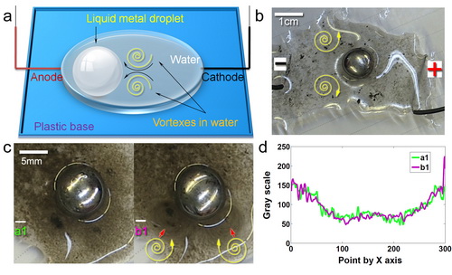 此项工作源于团队长期以来在液态金属领域不断研究推进中的偶然发现。论文通过系统的实验,揭示出室温液态金属具有可在不同形态和运动模式之间转换的普适变形能力。比如,浸没于水中的液态金属对象可在低电压作用下呈现出大尺度变形、自旋、定向运动,乃至发生液球之间的自动融合、断裂-再合并等行为,且不受液态金属对象大小的限制;较为独特的是,一块很大的金属液膜可在数秒内即收缩为单颗金属液球,变形过程十分快速,而表面积改变幅度可高达上千倍;此外,在外电场作用下,大量彼此分离的金属液球可发生相互粘连及合并,直至融合成单一的液态金属球;依据于电场控制,液态金属极易实现高速的自旋运动,并在周围水体中诱发出同样处于快速旋转状态下的漩涡对;若适当调整电极和流道,还可将液态金属的运动方式转为单一的快速定向移动。研究表明,造成这些变形与运动的机制之一在于液态金属与水体交界面上的双电层效应。以上丰富的物理学图景革新了人们对于自然界复杂流体、软物质特别是液态金属材料学行为的基本认识。这些超越常规的物体构象转换能力很难通过传统的刚性材料或流体介质实现,它们事实上成为用以构筑可变形智能机器的基本要素,为可变形体特别是液体机器的设计和制造开辟了全新途径。