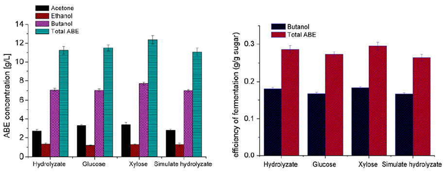 图1. 动态挤压预处理玉米秸秆酶水解糖与对比糖ABE发酵性能比较