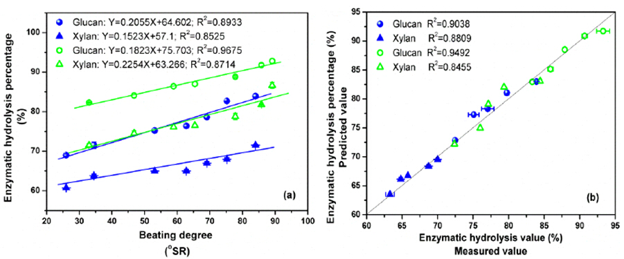 图2 打浆度和酶水解效率的关系及通过打浆度预测玉米秸秆的酶水解转化率