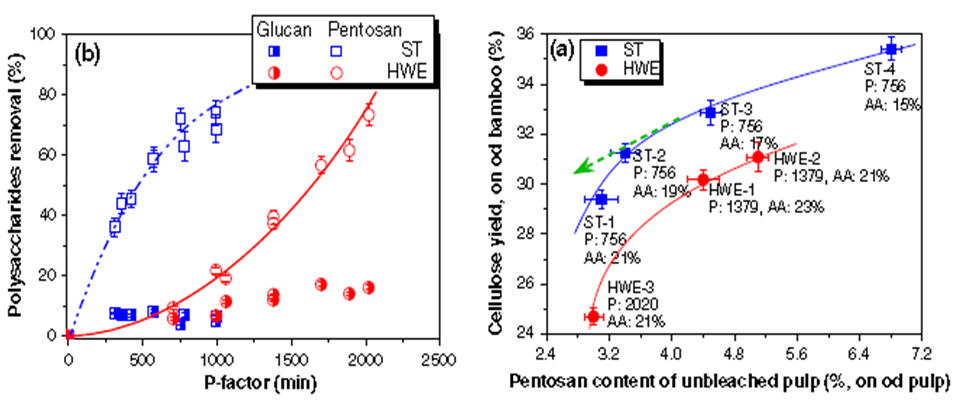 图5. 蒸汽和热水预处理对半纤维素溶出及纤维素得率的影响