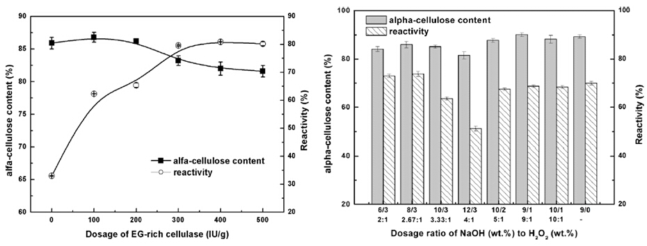 图6. 生物酶和化学法耦合处理对纤维素反应性能和α纤维素含量的影响
