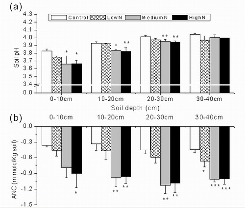 图1 长期氮沉降增加对中国南亚热带成熟林土壤酸化(a)和酸中和能力(b)的影响