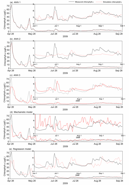 不同模拟方法的藻类模拟结果。(a-c)三种不同结构的神经网络模型;(d)机理过程模型;(e)回归模型