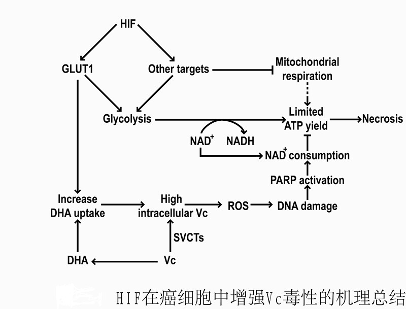 该研究团队以肾透明型肾癌细胞(CCRCC)作为肿瘤细胞研究模型,通过研究维生素C对肾癌细胞产生细胞毒性的机理,发现维生素C可以通过依赖低氧诱导因子(HIF)介导细胞死亡,且这一现象也被广泛发现于其他癌细胞中。以此为切入点进一步发现,HIF阳性的肾癌细胞可以通过肿瘤细胞普遍高表达的葡萄糖受体GLUT1在胞内累积更多的维生素C,并与胞内的铁离子反应产生更多的活性氧基团(ROS),进而诱发严重的DNA损伤。细胞对DNA损伤的修复会大量消耗胞质内的NAD+,由于HIF阳性的肾癌细胞通过“Warburg 效应”依赖低效率的糖酵解途径获取能量,其对NAD+骤降的缓冲能力较弱,细胞因此不可逆地走向了坏死。