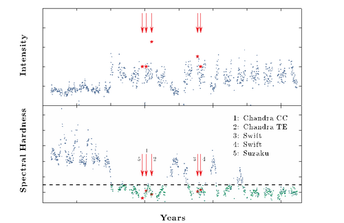 上图:日本MAXI/ASM卫星观测的天鹅座黑洞强度时间演化图。下图:相对应的光谱硬度图(光谱硬度越低,表明吸积盘成分占主导,虚线之下的数据适合于自旋测量分析)。图中箭头和星号标明了各个卫星的观测时间。