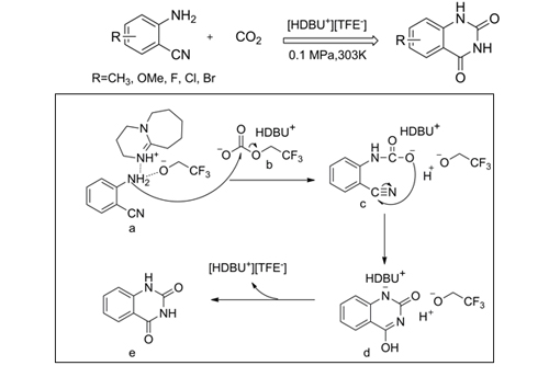 最近,研究人员通过设计合成双功能离子液体([HDBU+][TFE-]),发展了面向常温常压下CO2与邻氨基苯腈类化合物反应合成喹唑啉-2,4(1H,3H)-二酮类化合物的新型催化体系。该离子液体由有机碱和弱质子给体三氟乙醇(TFE)中和反应制得,可在常温常压下吸收CO2,捕集容量高达1.01 mol/mol。研究发现,离子液体的阴离子可活化CO2分子,其阳离子和阴离子通过氢键作用共同活化邻氨基苯腈底物分子,最终导致产物生成。考察了一系列含有不同取代基的邻氨基苯腈与CO2的反应,均获得相应的喹唑啉-2,4(1H,3H)-二酮产物。该离子液体使反应在无溶剂、无金属参与条件下进行,是一种实现温和条件下CO2化学转化的绿色催化体系,具有广阔的应用前景(Angew. Chem. Int. Ed. 2014, 53, 5922~5925)。
