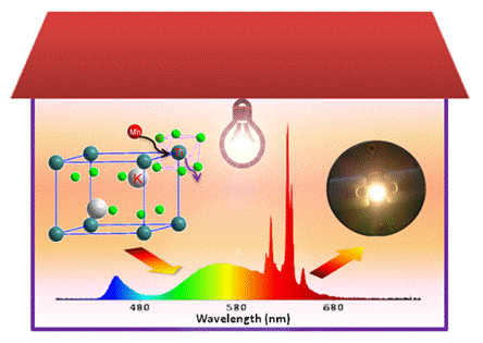 白光LED由于其节能、环保以及长寿命等特点成为下一代照明器件。目前,商品化的白光LED主要采用蓝光芯片激发 YAG:Ce3+黄光荧光粉,芯片发出的蓝光与荧光粉发射的黄光混合形成白光。但是,YAG:Ce3+荧光粉的发射光谱中红光组份不足,采用单一YAG:Ce3+荧光粉较难获得低色温(Correlated Color Temperature,CCT< 4500 K)、高显色指数(Color Rendering Index,CRI>80)的暖白光器件,导致了其在室内通用照明中应用的局限性。为解决这一问题,需在器件中添加适当的红光荧光粉,以补充红光组份,从而制备出低色温、高显色指数的暖白光LED器件。目前,性能较好的商品化红光荧光粉主要为稀土掺杂的氮(氧)化物材料,但是,该类荧光粉存在发射带宽过宽、制备工艺苛刻等缺点,导致其流明效率偏低且价格昂贵。因此,开发能被蓝光芯片有效激发的低成本、窄带发射红光荧光粉尤其是替代稀土发光材料成为人们关注的焦点,这也是提高暖白光LED流明效率的关键。